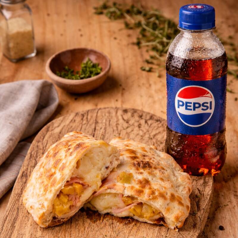 Calzone relleno de tocineta , maíz y queso mozarella, acompañado de Gaseosa de 250 ml.