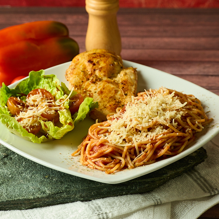 Filete de Pollo a la plancha, pasta a elección y ensalada de la casa.