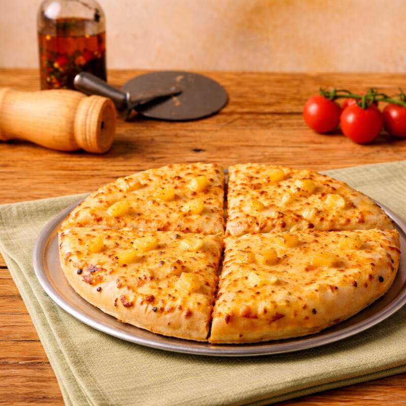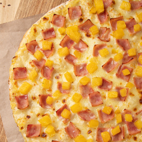 Jamón y piña. Base delgada y crocante, acompañada de salsa y queso.