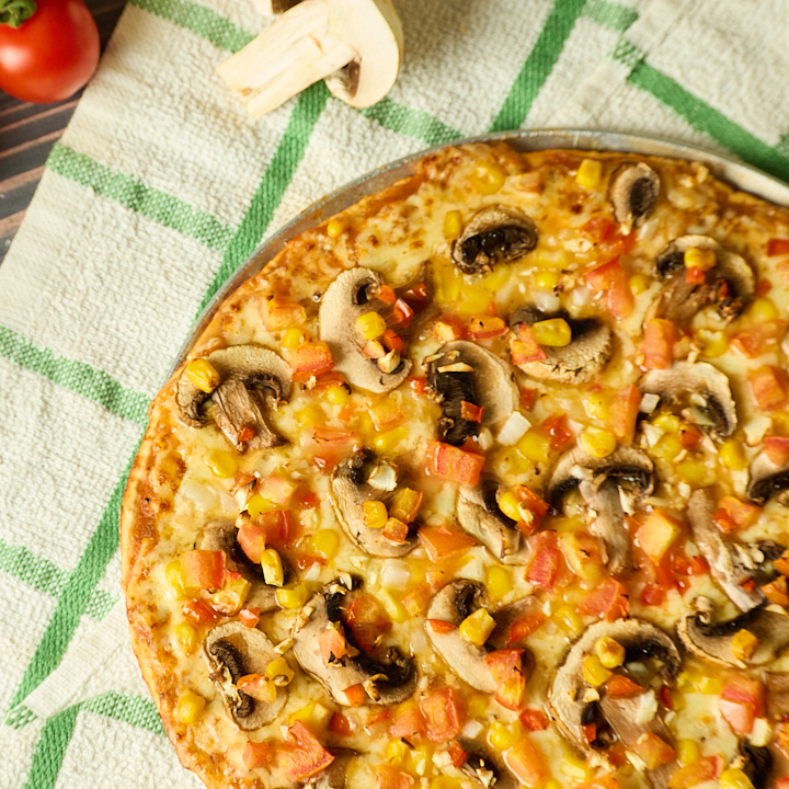 Champiñones, maíz tierno, cebolla, pimentón, ajo y tomate. Base delgada y crocante, acompañada de salsa y queso.