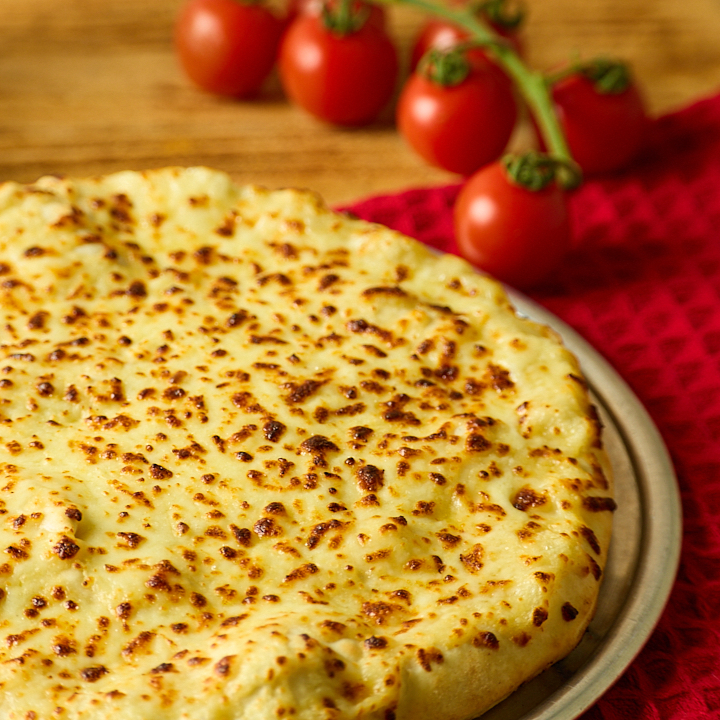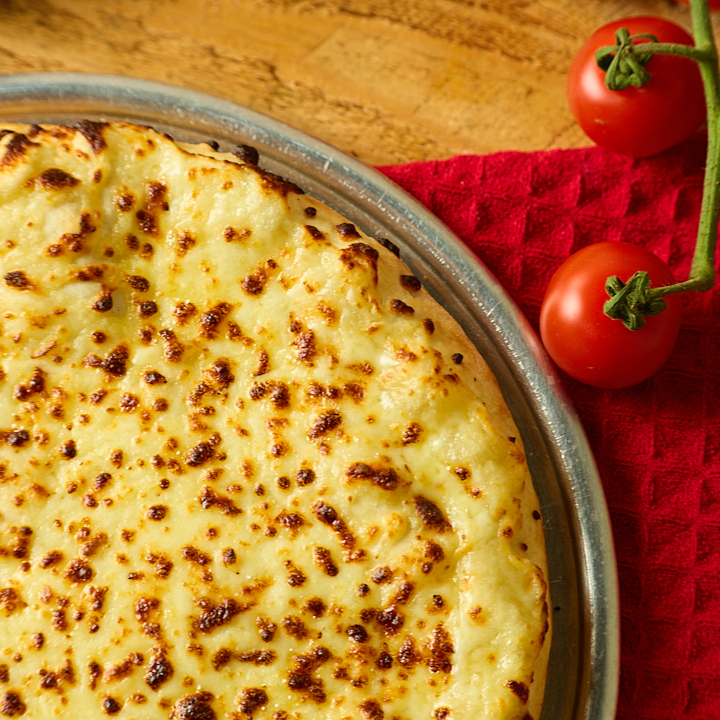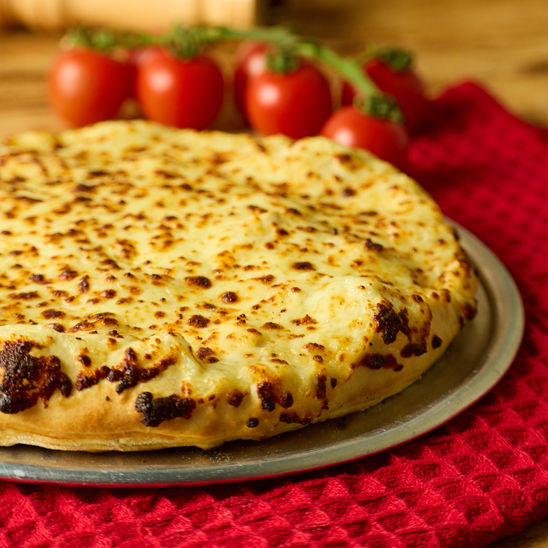 Pizza rellena de queso crema , cubierta con una delgada capa de masa y triple queso fundido.