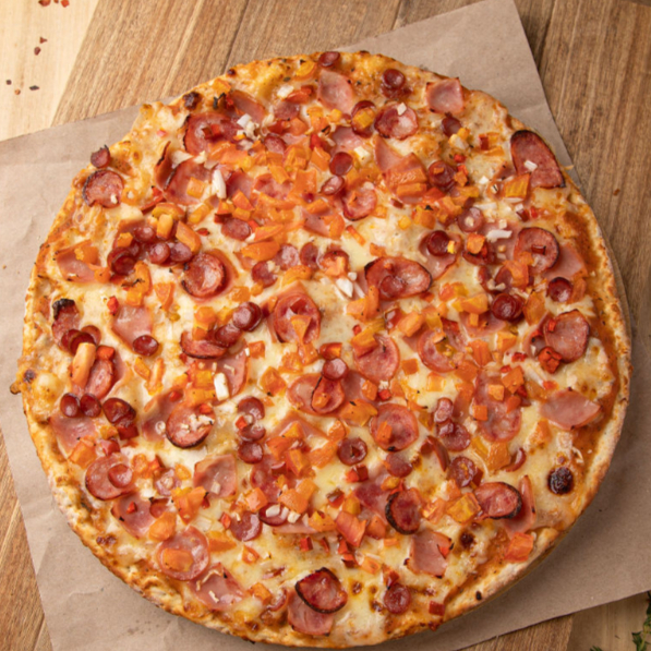 Jamón, salami, cábano, cebolla, pimentón y tomate. Base delgada y crocante, acompañada de salsa y queso.