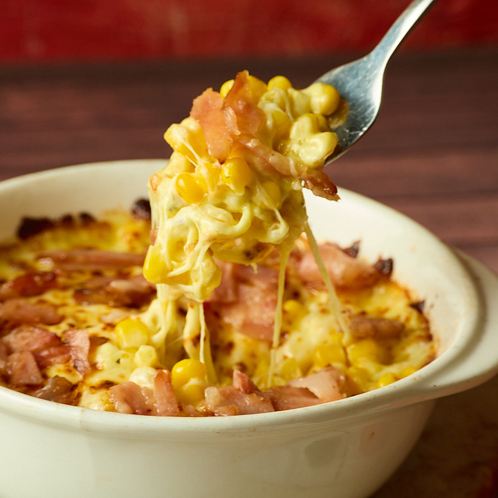 Delicioso maíz tierno acompañado de tocineta, queso gratinado y salsa de la casa.