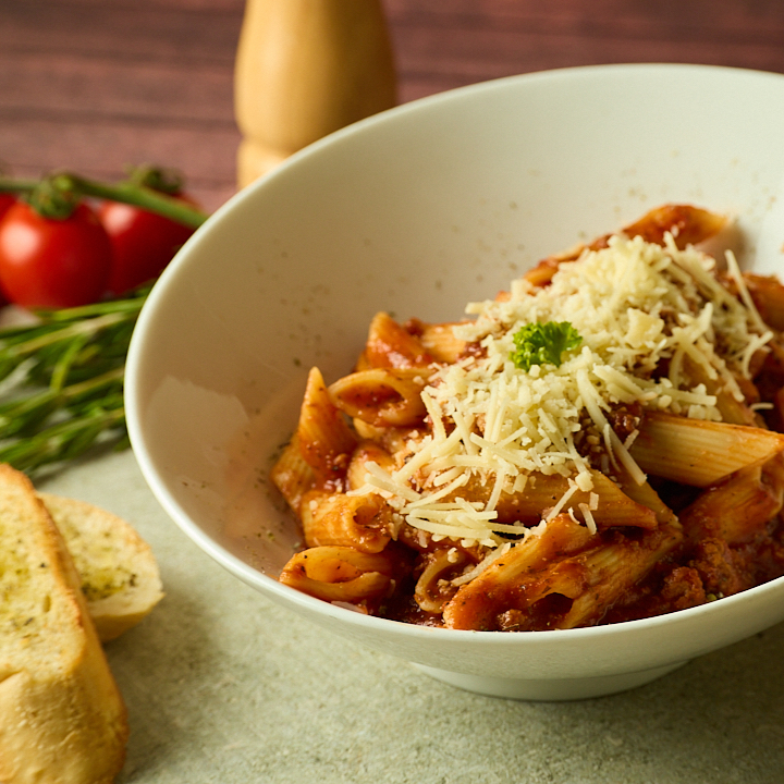 Pasta a elección acompañada de carne boloñesa pan baguette.