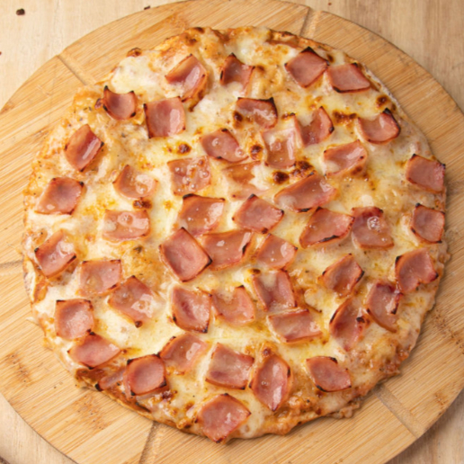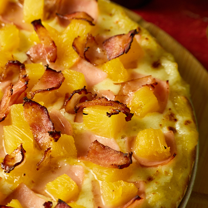 Jamón, tocineta y piña. Base delgada y crocante, salsa y queso.