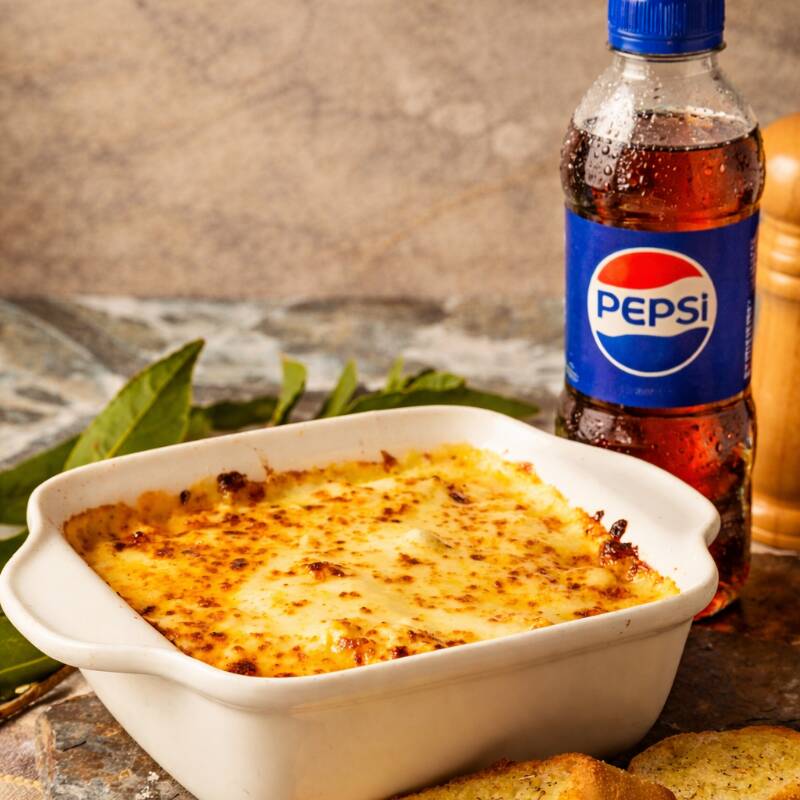 Lasañaa en salsa bolognesa, carne de res, pollo, salsa bechamel y queso mozzarella. + Gaseosa 250 ml.