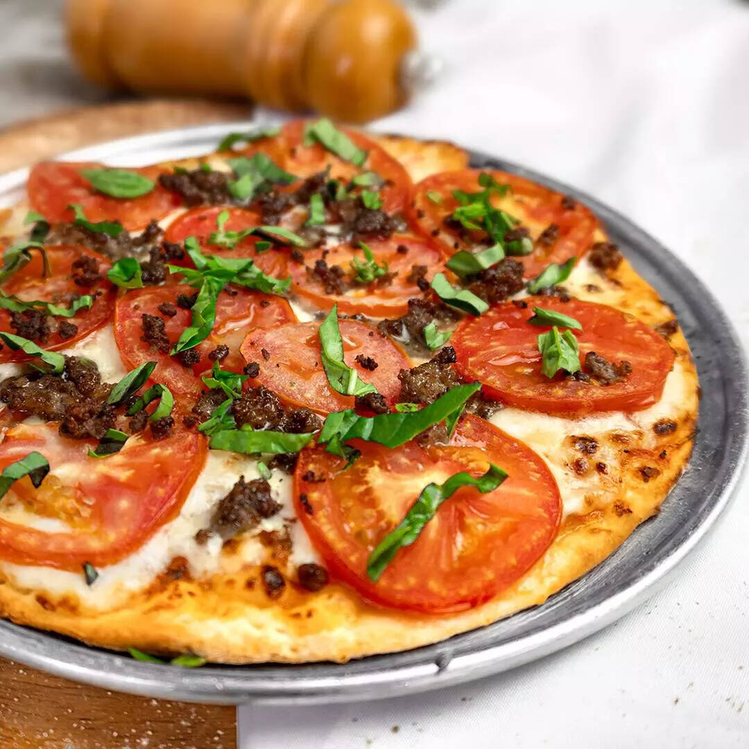 Carne bolognesa, rodajas de tomate al horno, pimienta y albahaca fresca. Base delgada y crocante, salsa y queso.