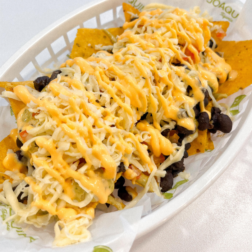 Totopo de maíz, almíbar de jalapeños y tamarindo, pico de gallo, guacamole, sour cream, queso cheddar y queso mozzarella rallado.