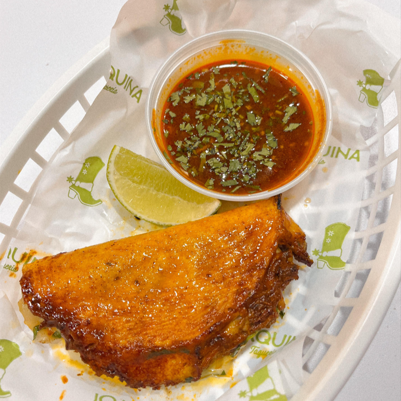 Birria de res, tortilla de maíz nixtamalizada, queso fundido, cebolla, cilantro y su caldo.