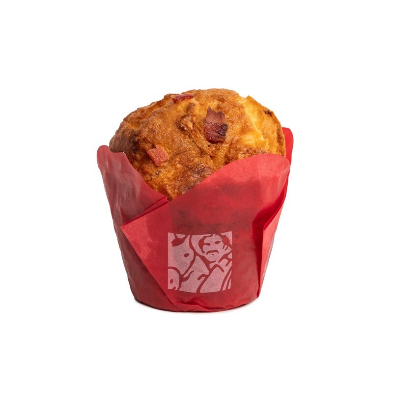 Muffin de queso con trozos de tocineta, esponjoso y suave, perfecto para cualquier momento del día.