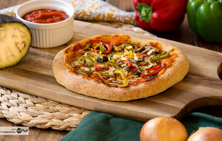Pizza peperoni de 6 porciones en masa madurada, rodajas de peperoni y queso mozarella.