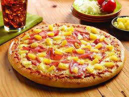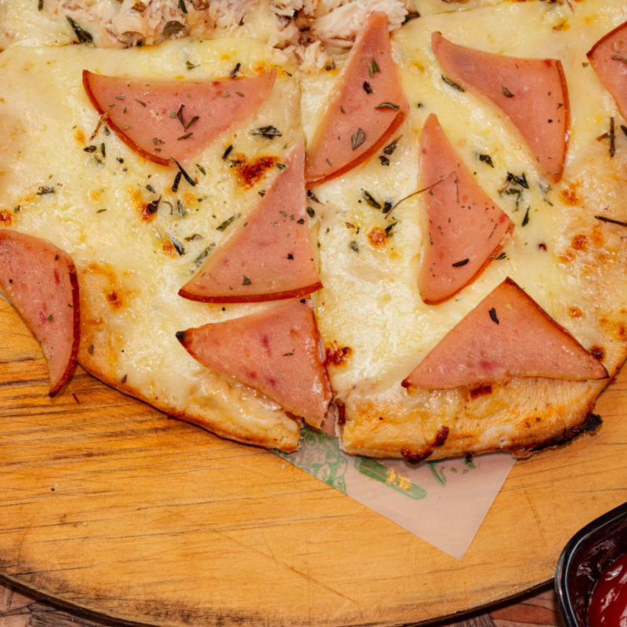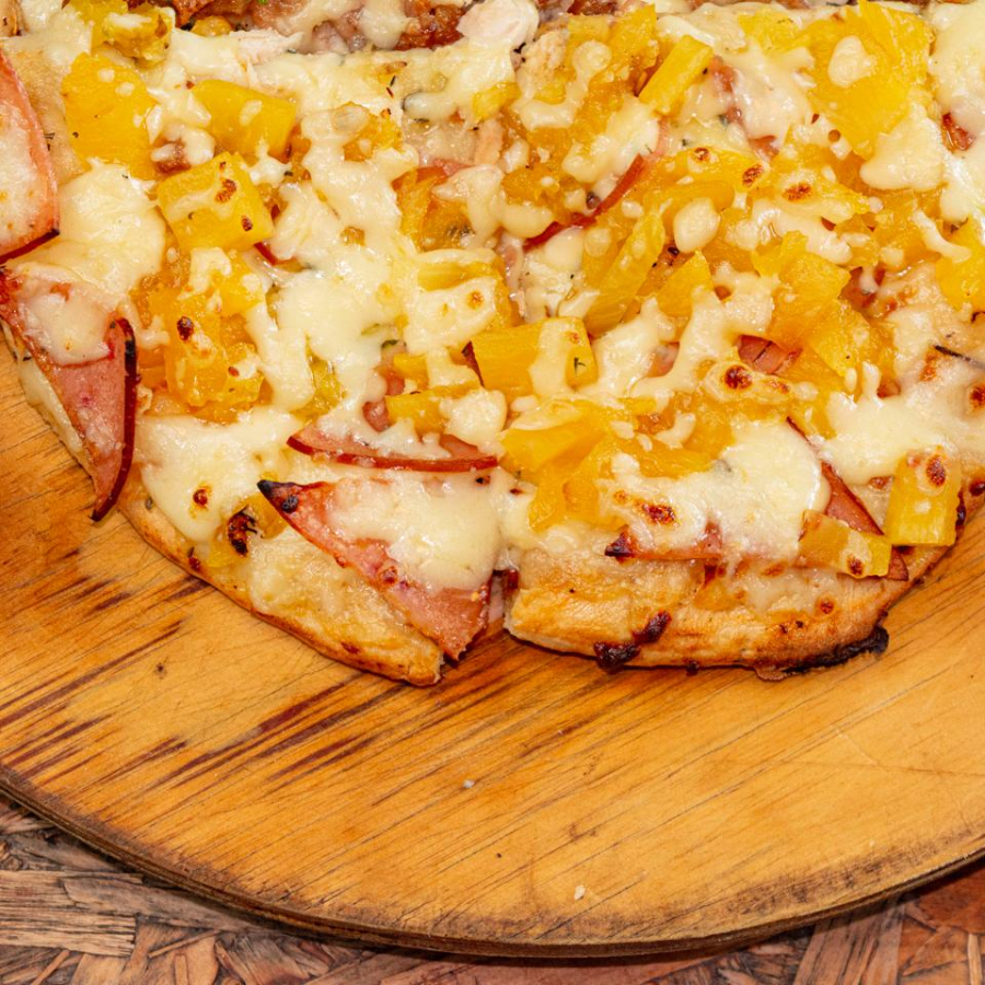 Pizza hawaiana de 8 porciones en masa madurada, salsa napolitana, jamon, queso mozarella y trozos de piña caramelizada.