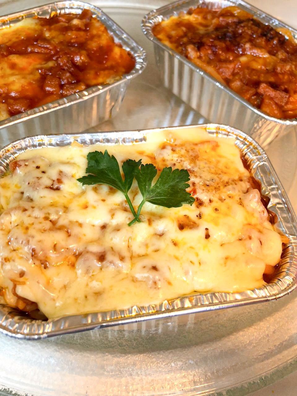 Lasaña de la casa mixta con carne de res, pollo desmechado, maíz tierno, tocineta y queso mozarella.
