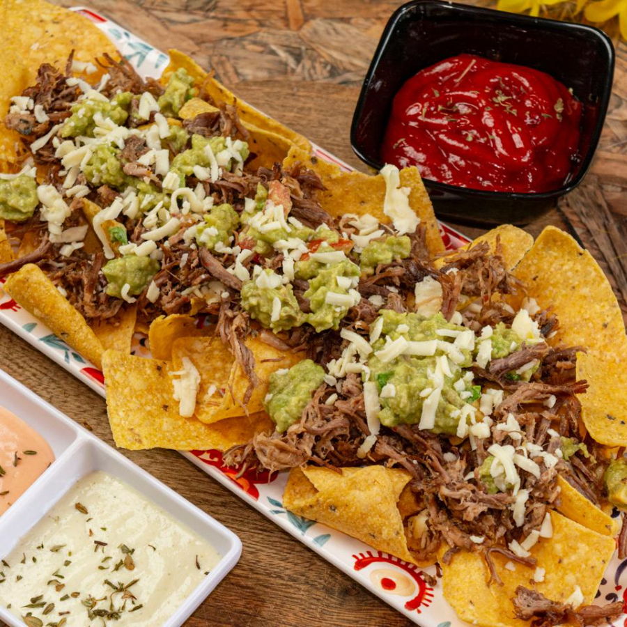 Nachos, carne desmechada, pico de gallo, salsa cheddar, queso y guacamole.