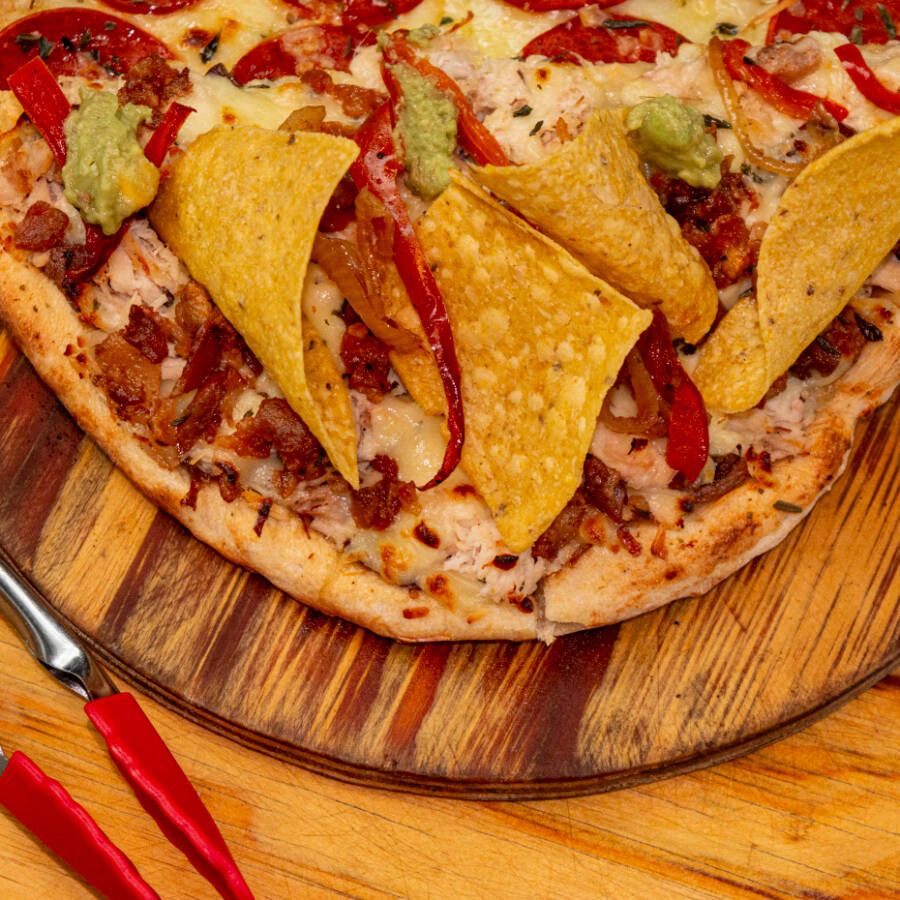 masa crocante, carne y pollo desmechado, tocineta, cebolla y pimenton, nachos, jalapeños, especias, queso mozzarella