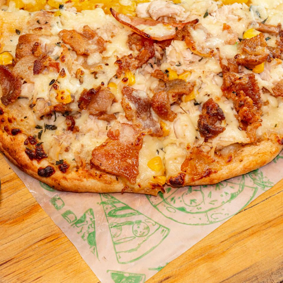 Pizza pollo tocineta de 8 porciones en masa madurada con pollo desmechado, tocineta, queso mozarella y maiz.