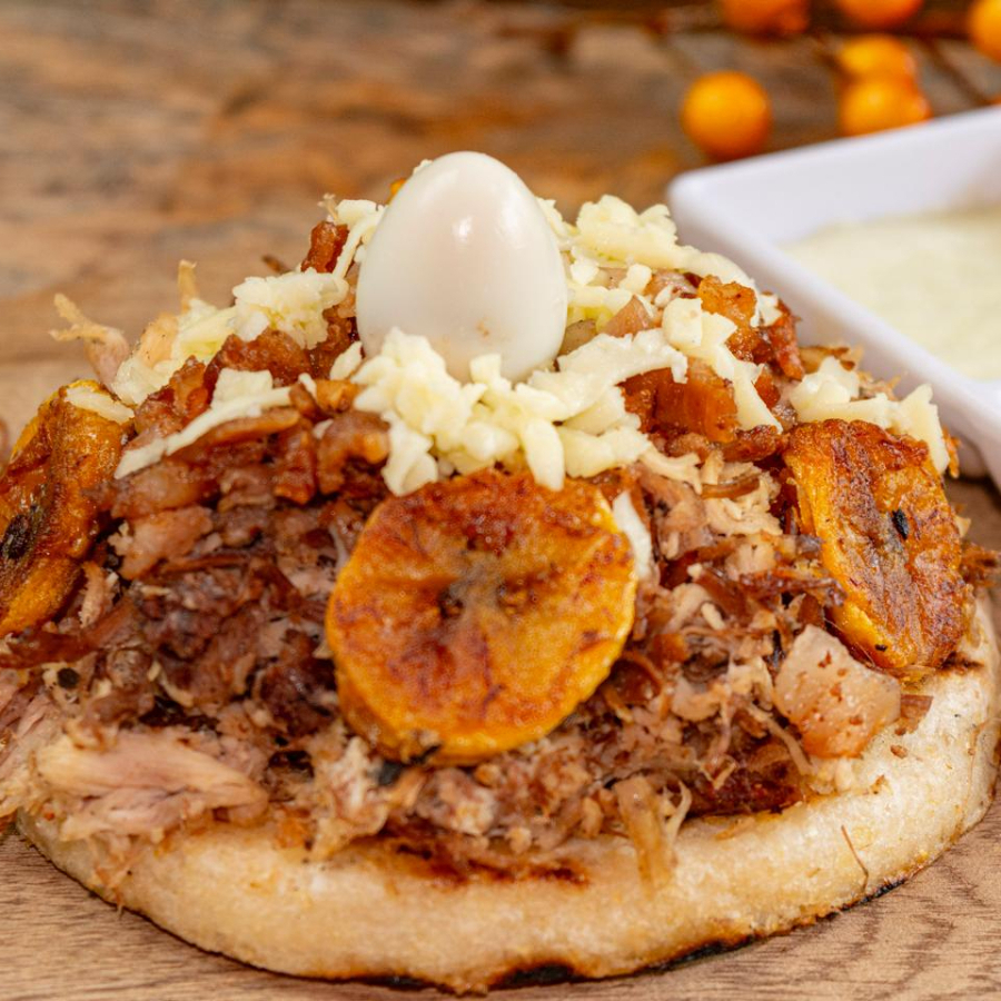 Pollo, carne, tocineta, maduro. queso y huevo de codorniz.