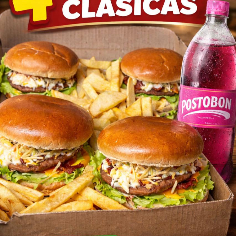 4 Hamburguesas clasicas papitas francesas gaseosa postobon 1.5