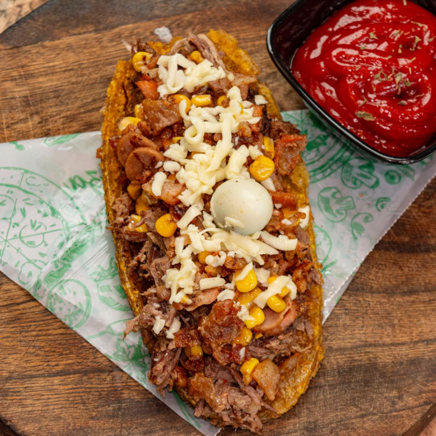 patacon pinton carne de res desmechada salchicha ranchera maiz queso salsas de la casa