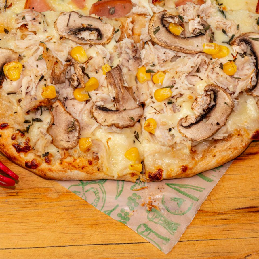 Pizza pollo y champiñon de 8 porciones en masa madurada con pollo desmechado, champiñon, queso mozarella y maiz.