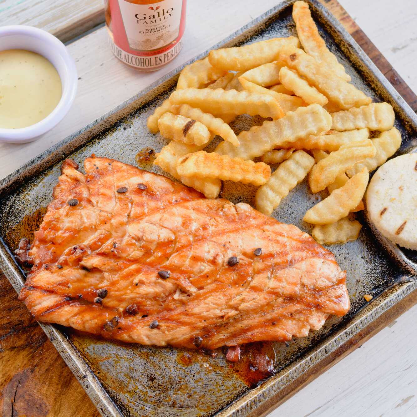 Delicioso corte de salmón asado a la parrilla, acompañado con guarniciones de la casa papas en cascos o papas francesas, arepa y ensalada de la casa.