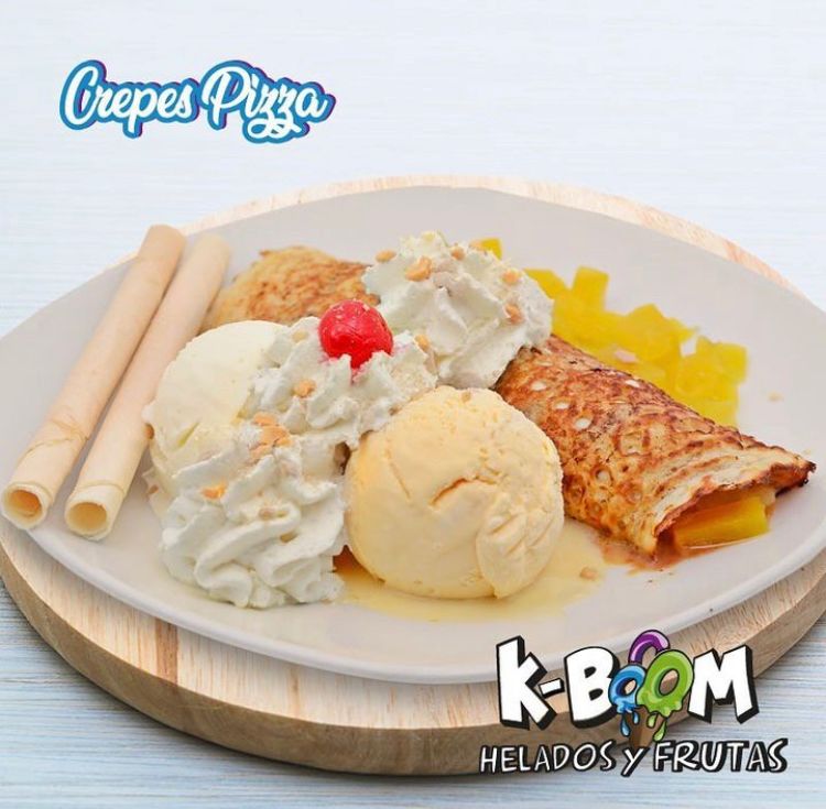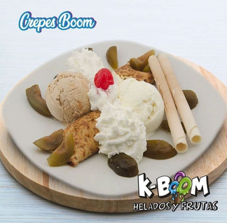 Tortilla artesana k boom, acompañada de un exquisito dulce de fresa k boom y queso crema, trozos frescos de kiwi y mango, chantillí, dos sabores de helado y leche condensada, contenido 16 oz.