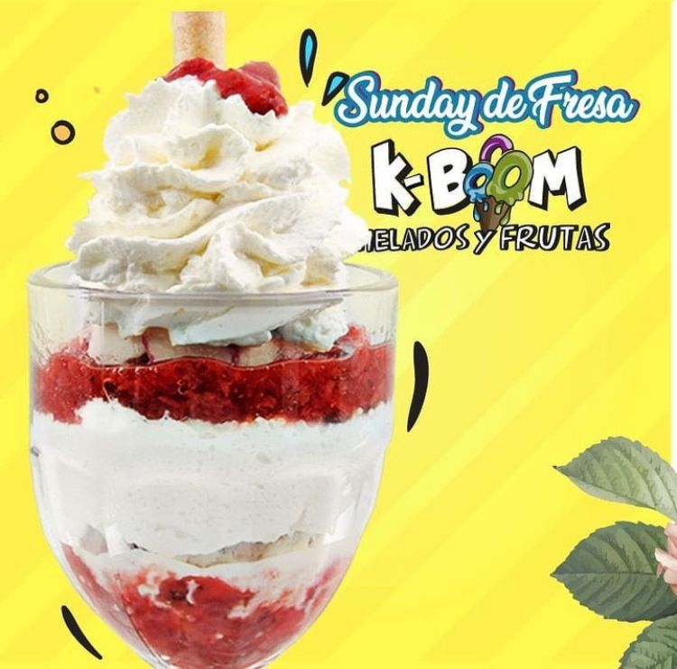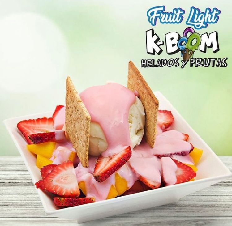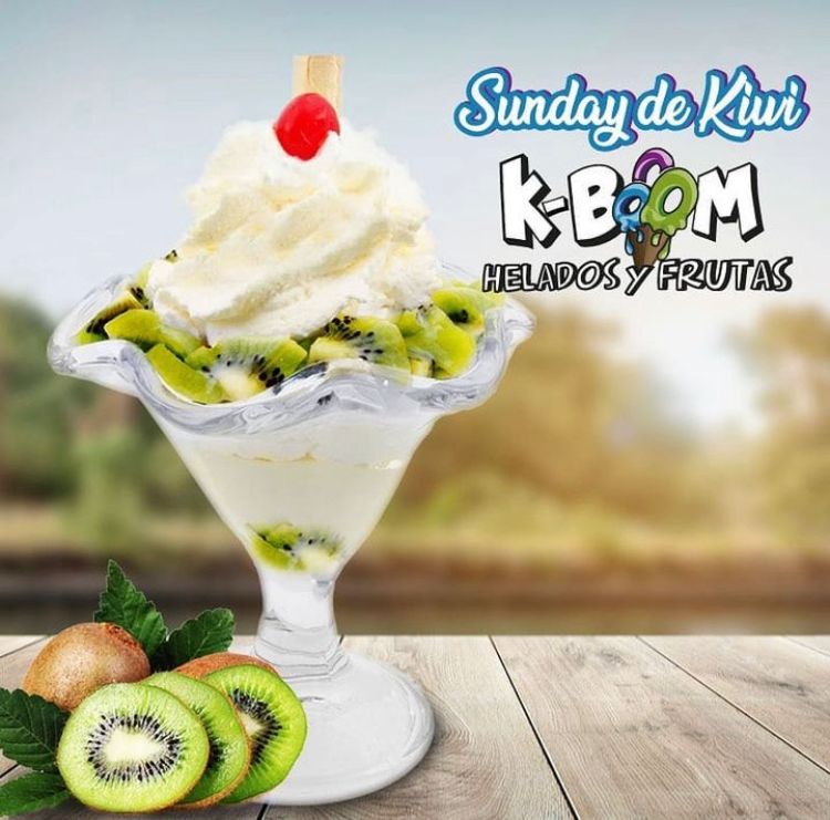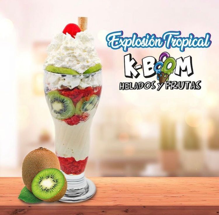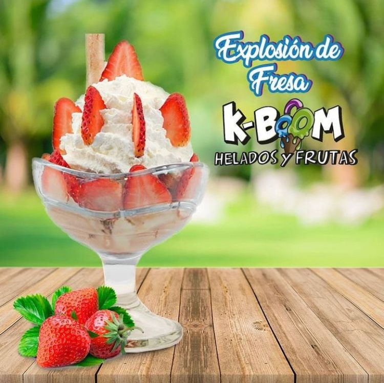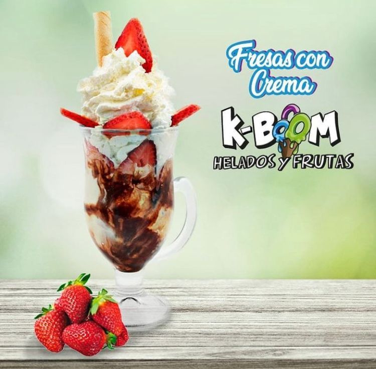 Exquisito dulce de fresa k boom, acompañado de fresco y jugoso kiwi, chantillí y dos sabores de helado, contenido 16 oz.