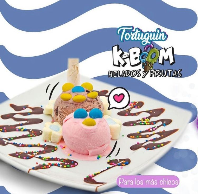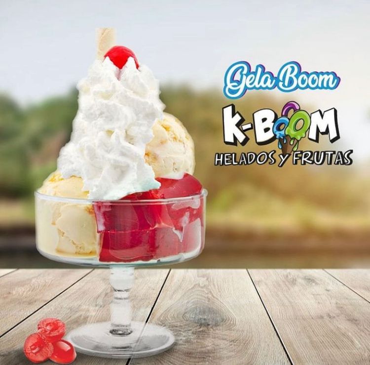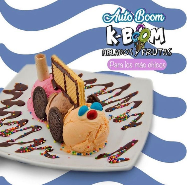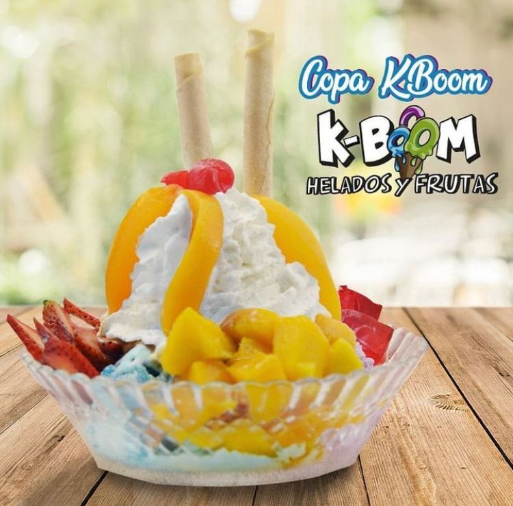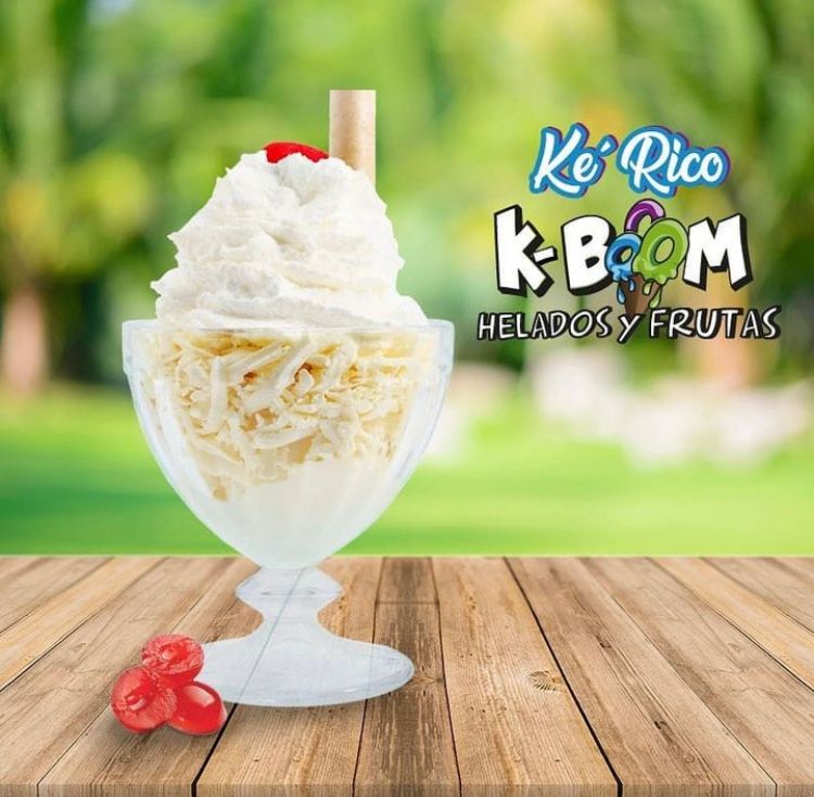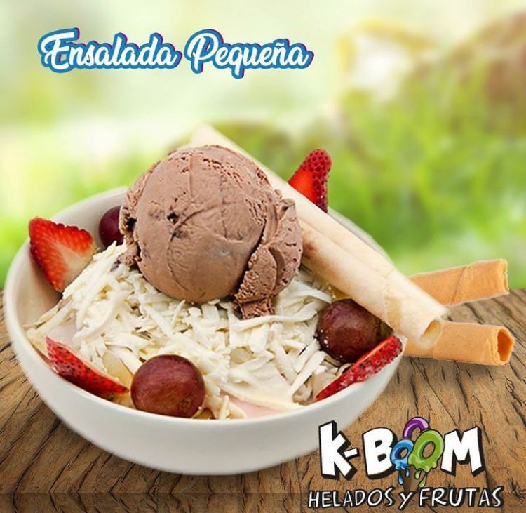 Exquisito dulce de fresa k boom, acompañado de fresco y jugoso kiwi, chantillí y dos sabores de helado, contenido 16 oz.