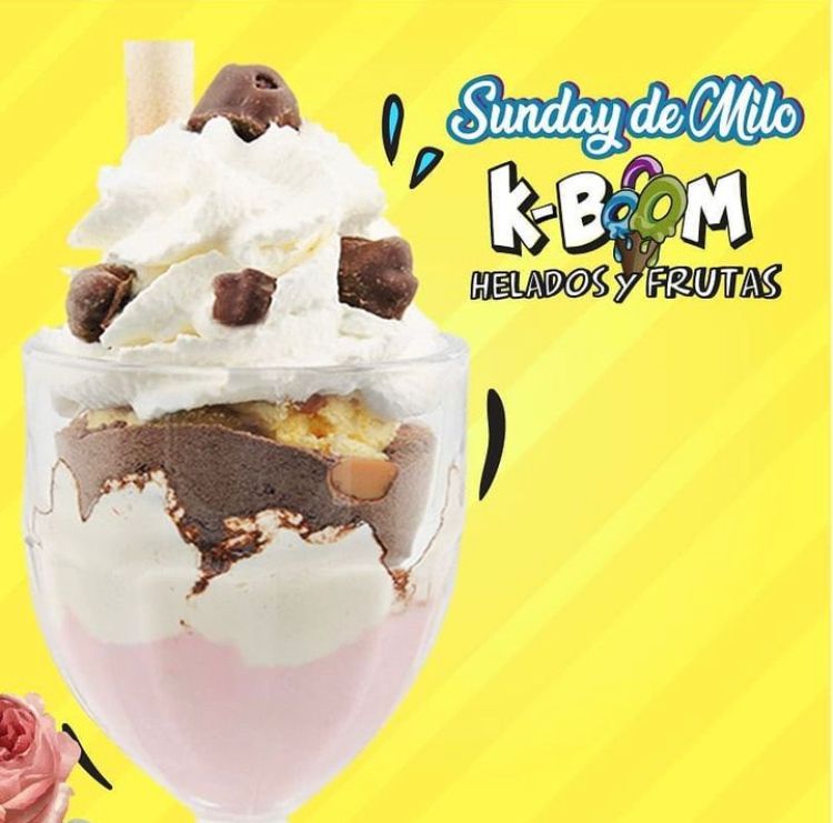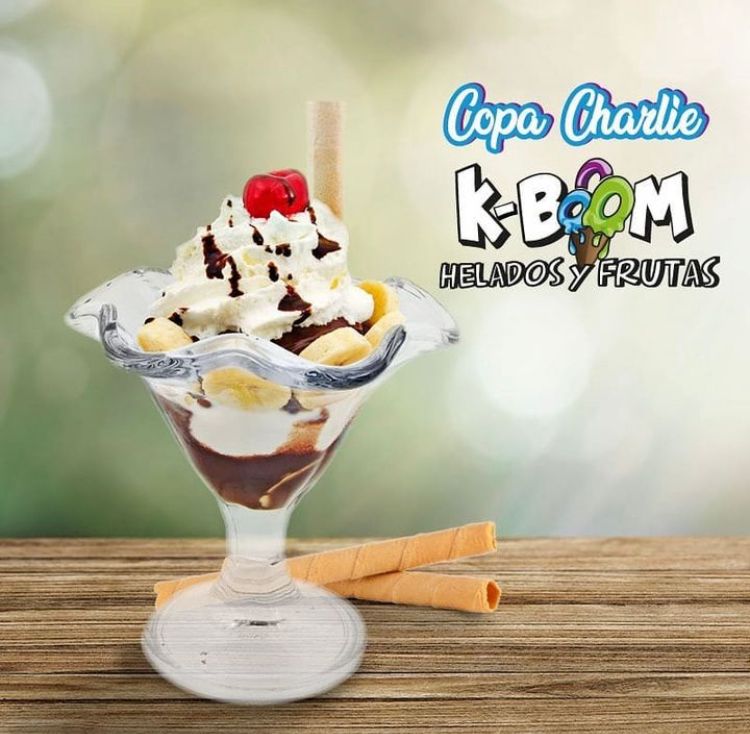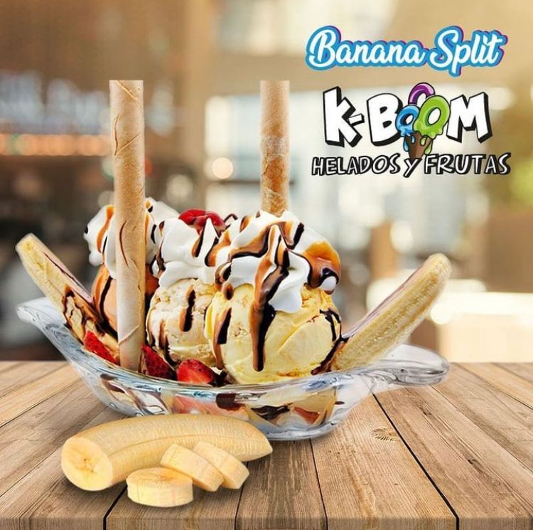 Exquisita combinación de crema de chocolate y avellanas con banano y la deliciosa salsa de chocolate k boom, acompañados de un sabor de helado y crema chantillí, contenido 12 oz.