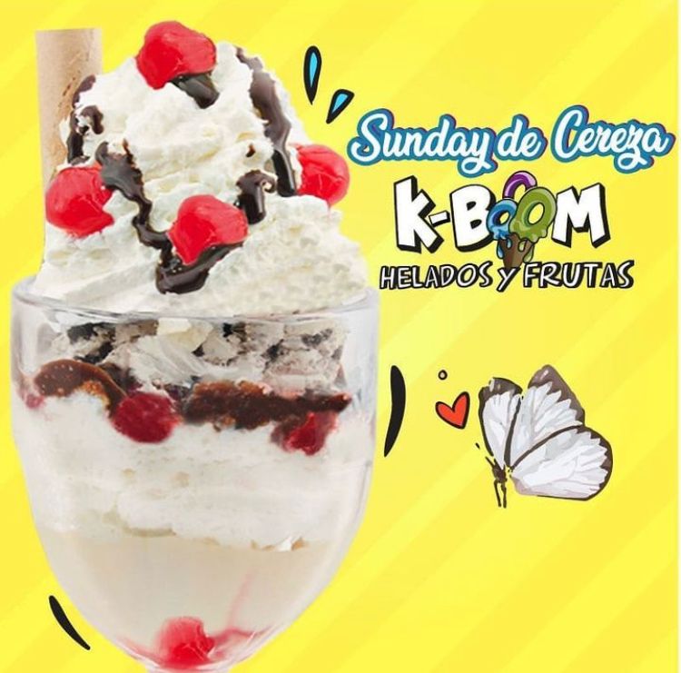 Frescas y jugosas cerezas en almíbar, acompañados de dos sabores de helado, crema chantillí y la rica salsa de chocolate k boom, contenido 16 oz.