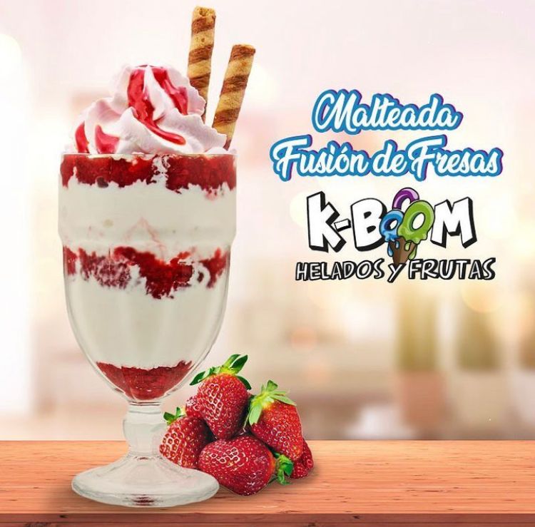 El más rico y tropical sabor de las fresas sumergidas en crema chantillí, acompañadas de un sabor de helado, salsa de chocolate k boom y leche condensada, contenido 14 oz.