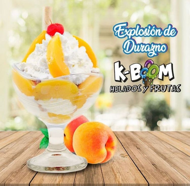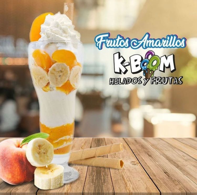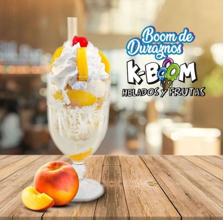 Deliciosa combinación de banano y duraznos con un exquisito dulce de maracuyá k boom, crema chantillí y dos sabores de helado, contenido 16 oz.