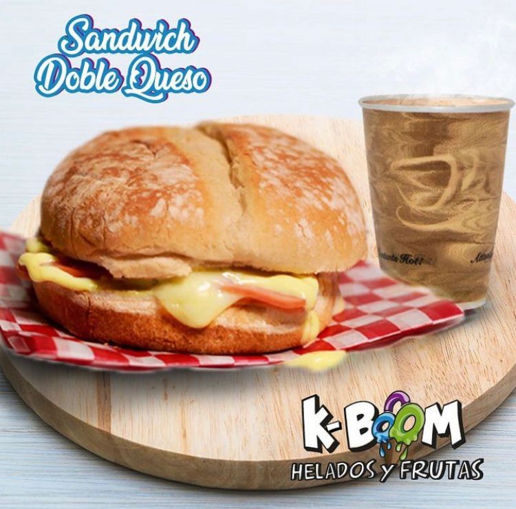 Delicioso sándwich doble queso, doble jamón y tomate, acompañado con un vaso de Milo frio de 9 oz.