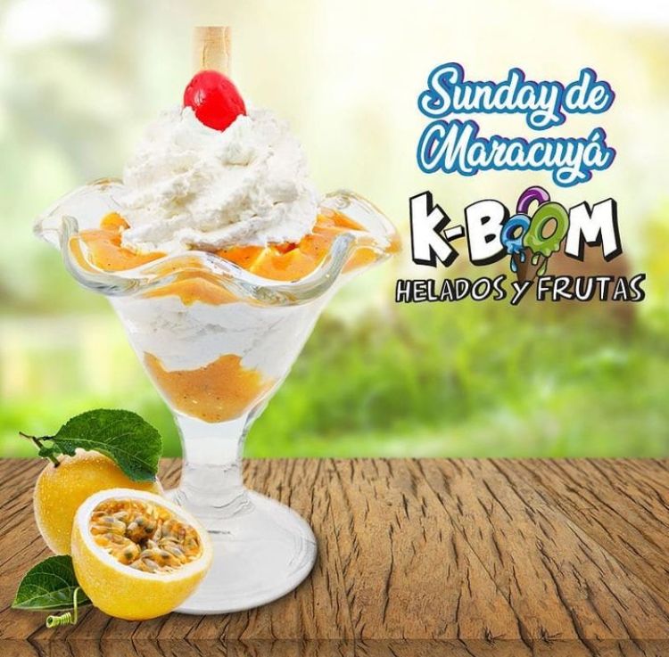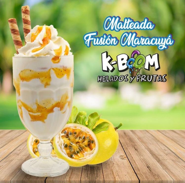 El inconfundible sabor del dulce de maracuyá k boom, acompañado de un sabor de helado y crema chantillí, contenido 12 oz.