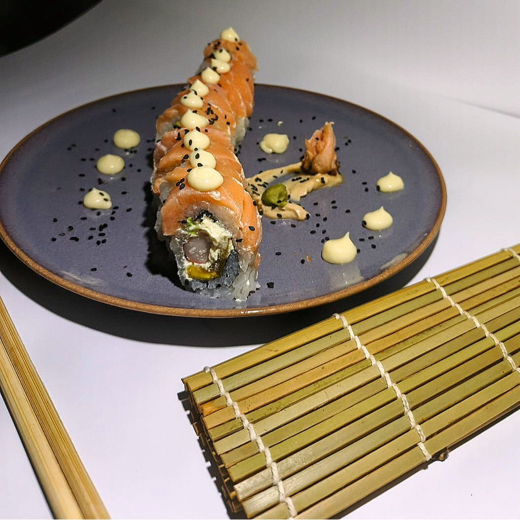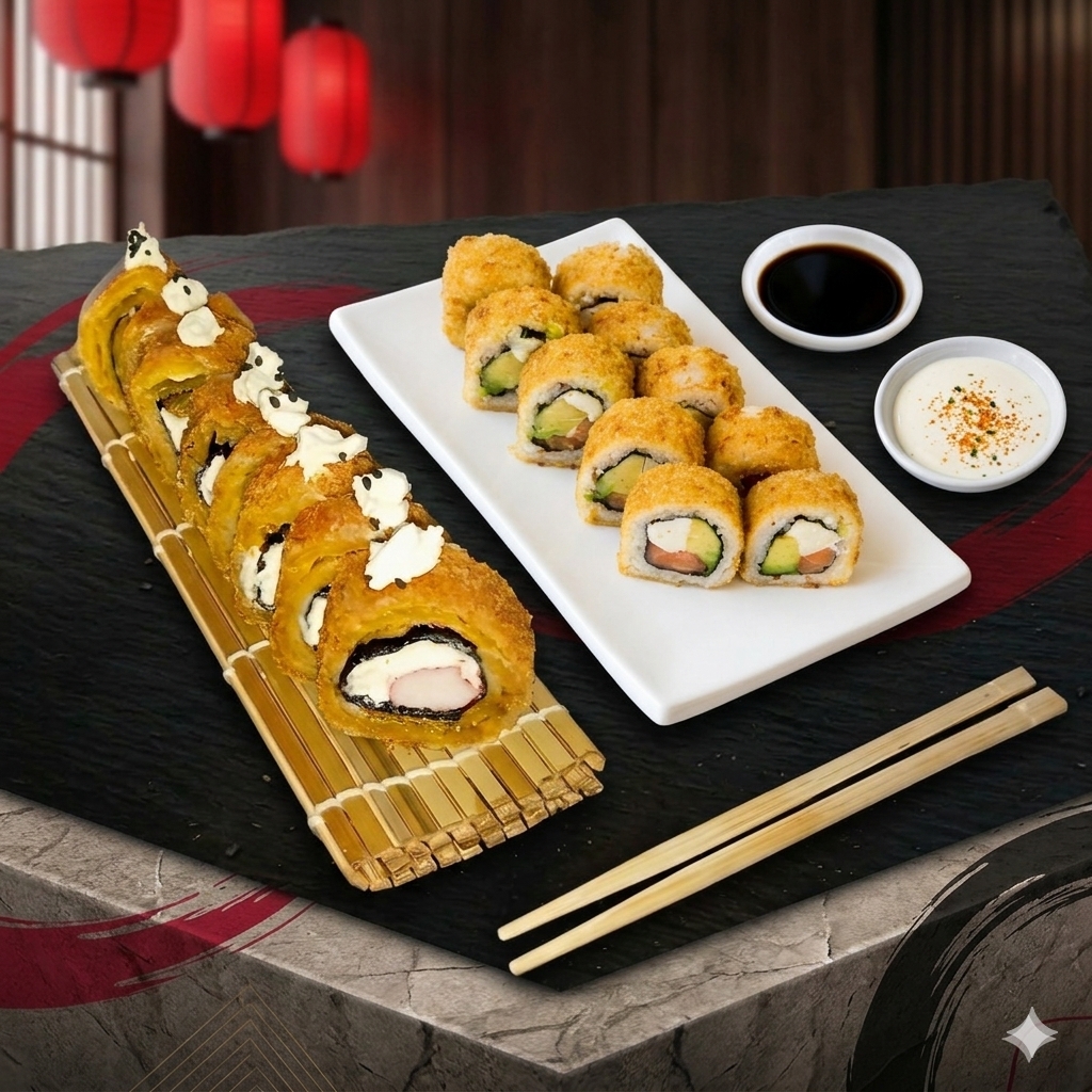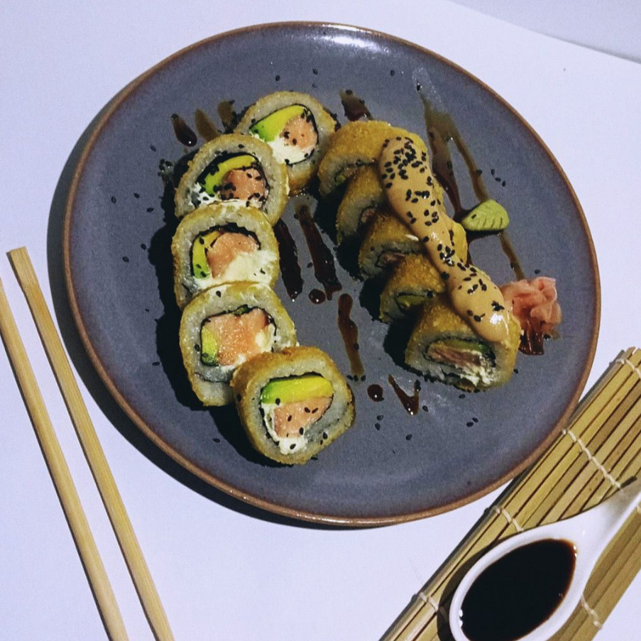 MAKI RELLENO DE SALMON QUESO CREMA Y AGUACATE,APANADO CON TOPING DE UNA SALSA DE LA CASA