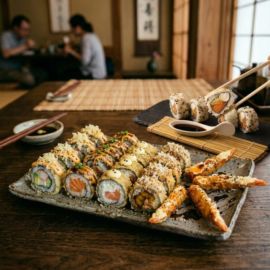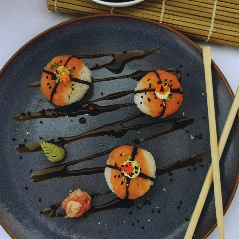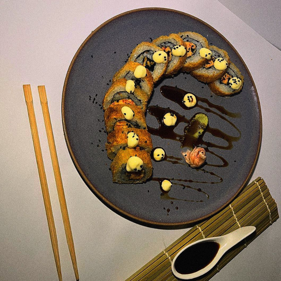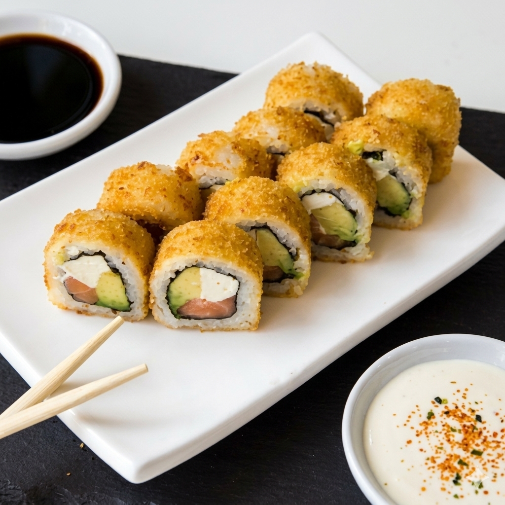 MAKI RELLENO DE SALMON QUESO CREMA Y AGUACATE,APANADO CON TOPING DE UNA SALSA DE LA CASA