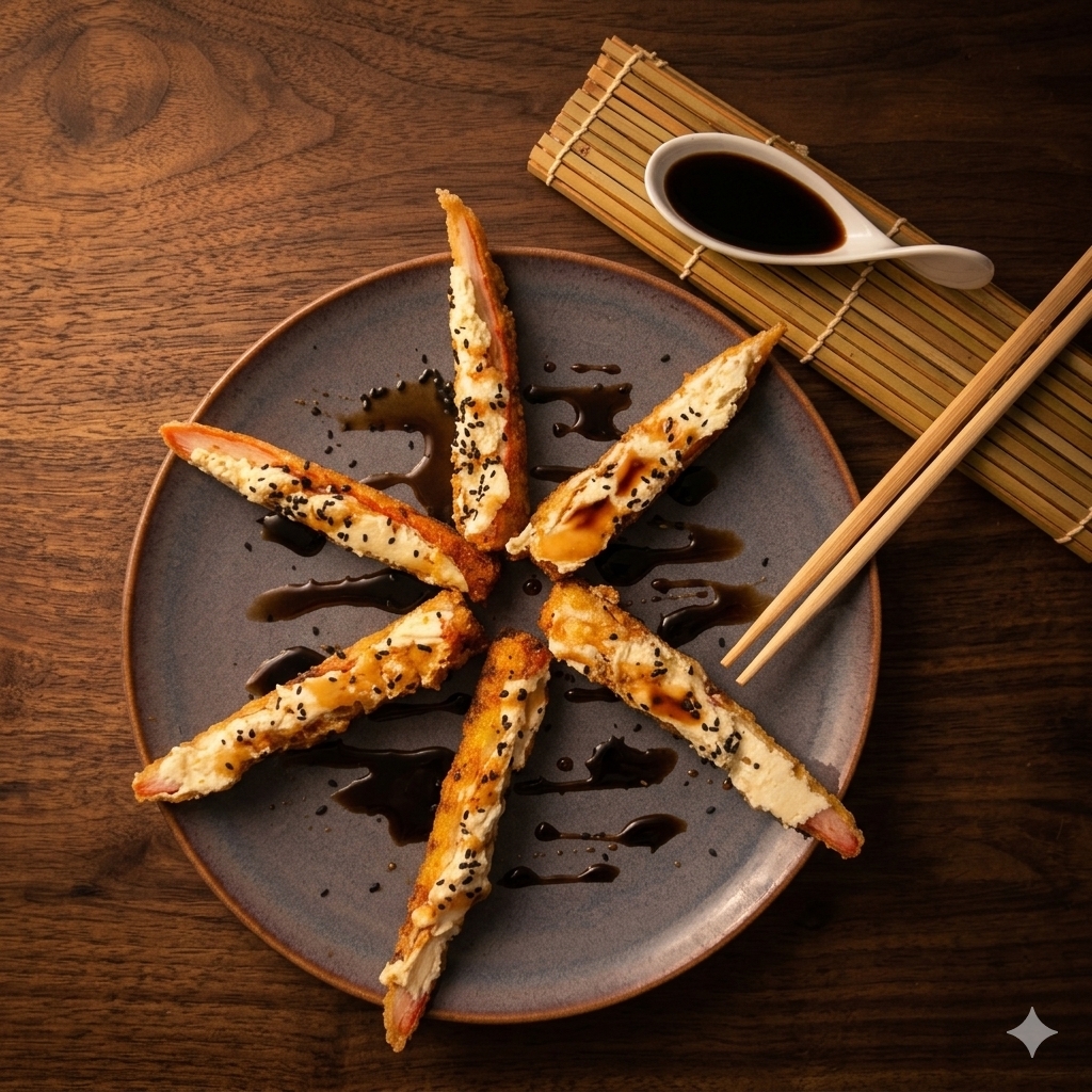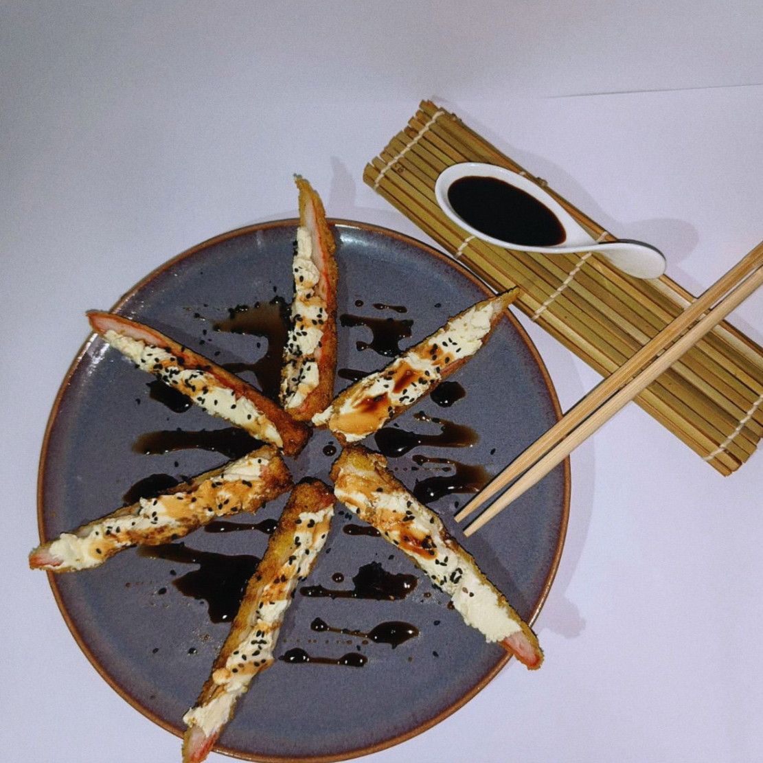 PALMITOS DE CANGREJO APANADOS RELLENO DE QUESO CREMA BAÑADOS EN SALSA DE ANGUILA