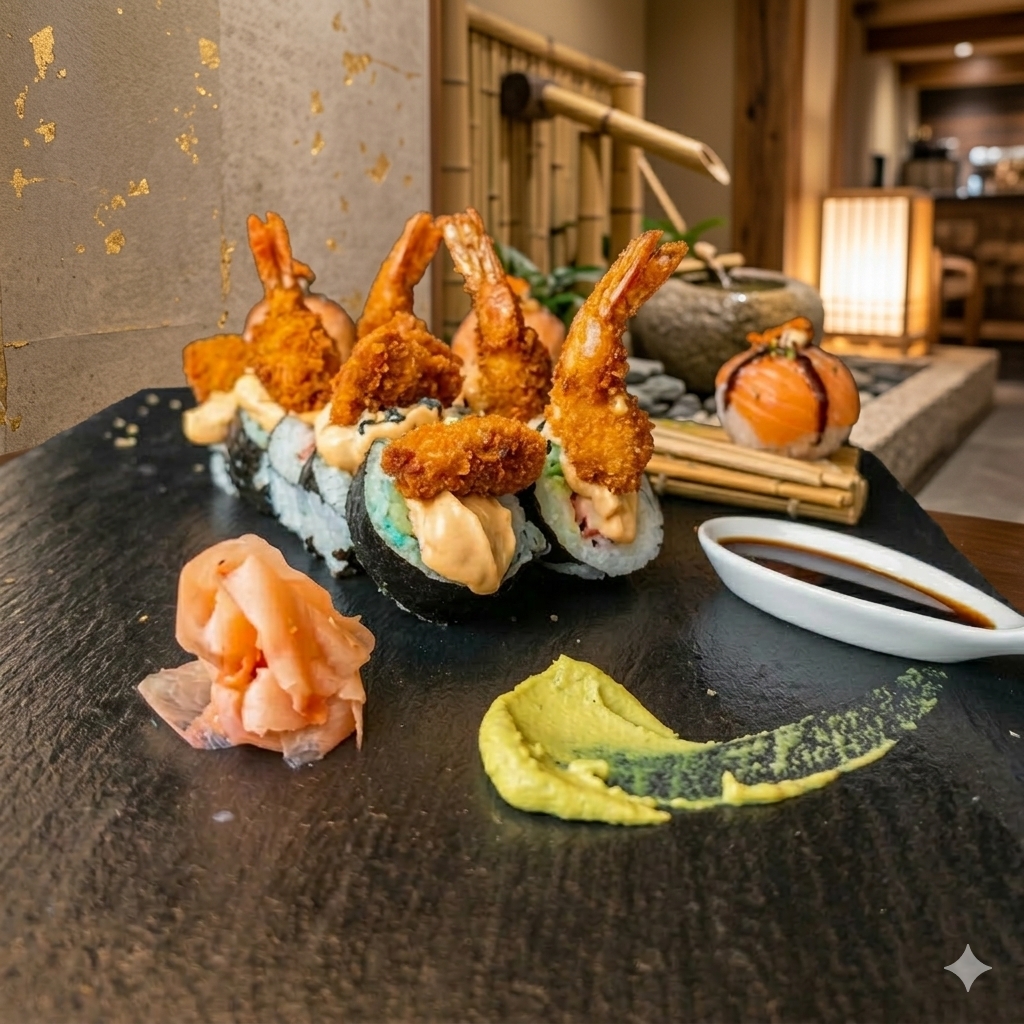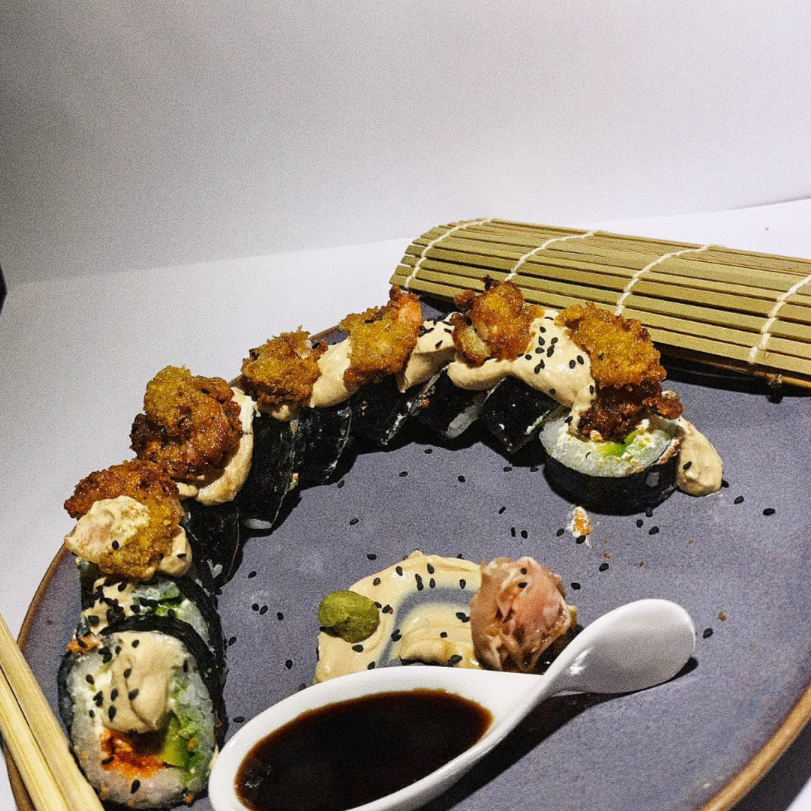 MAKI RELLENO DE AGUCATE Y MASAGO, CON UN TOPING DE CACARONES APANADOS Y SALSA DRAGON