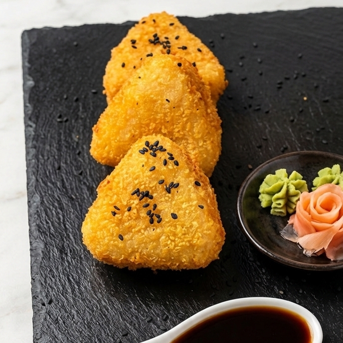 TRINANGULO DE ARROZ RELLENOS DE KANIKAMA ADEREZADOS CON UNA MAYO DINAMITA APANADOS