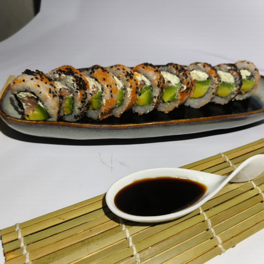 RELLENO DE SALMON FRESCO,QUESO CREMA Y AGUACATE CON TOPING DE CAVIAR Y AJONJOLI