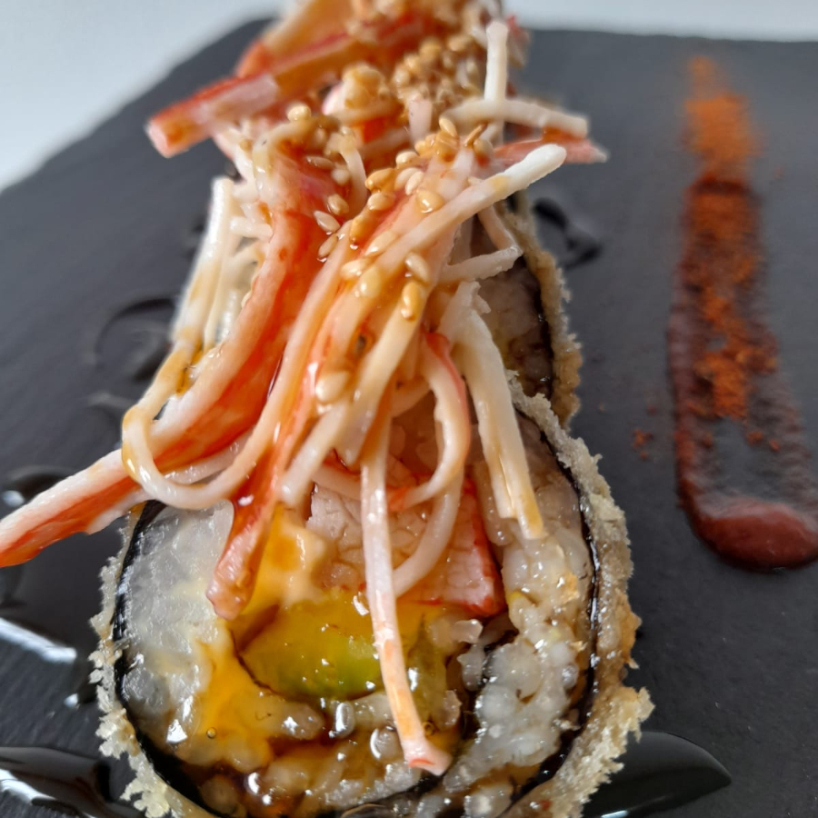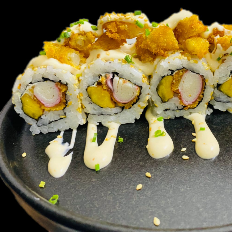 10 roll rellenos de cangrejo apanado, queso crema, aguacate y plátano maduro con topping de yuca crocante acompañado con salsa a base de curry
