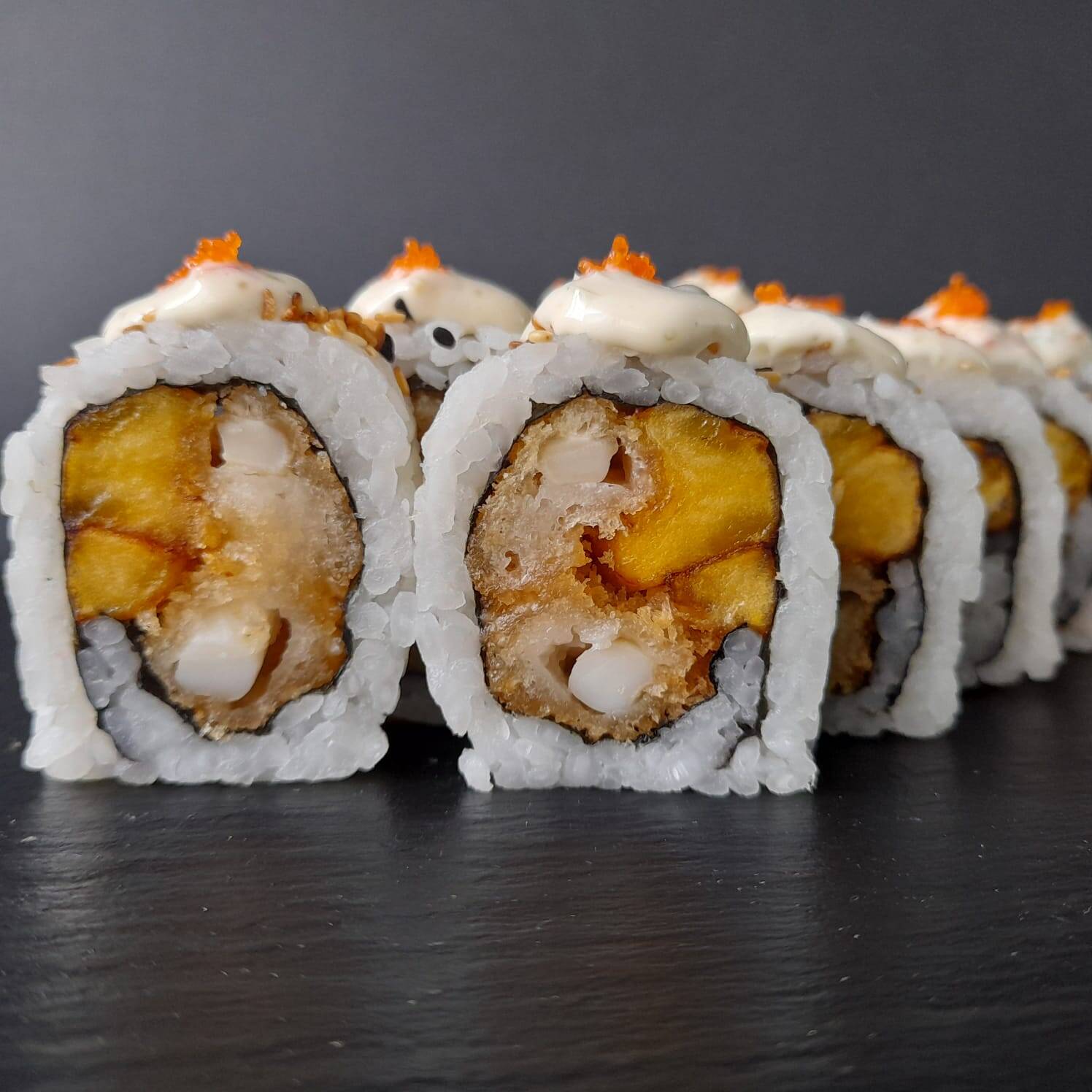 Sushi 10 bocados con queso crema, mango, palmito tempura, con ajonjolí.