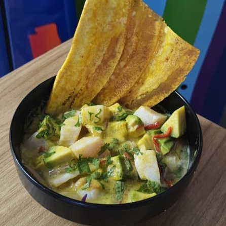 200 gr de pesca blanca, mezclados y marinados en aji amarillo, acompañado de chips de platano verde, finalizado con cilantro. (picante medio)