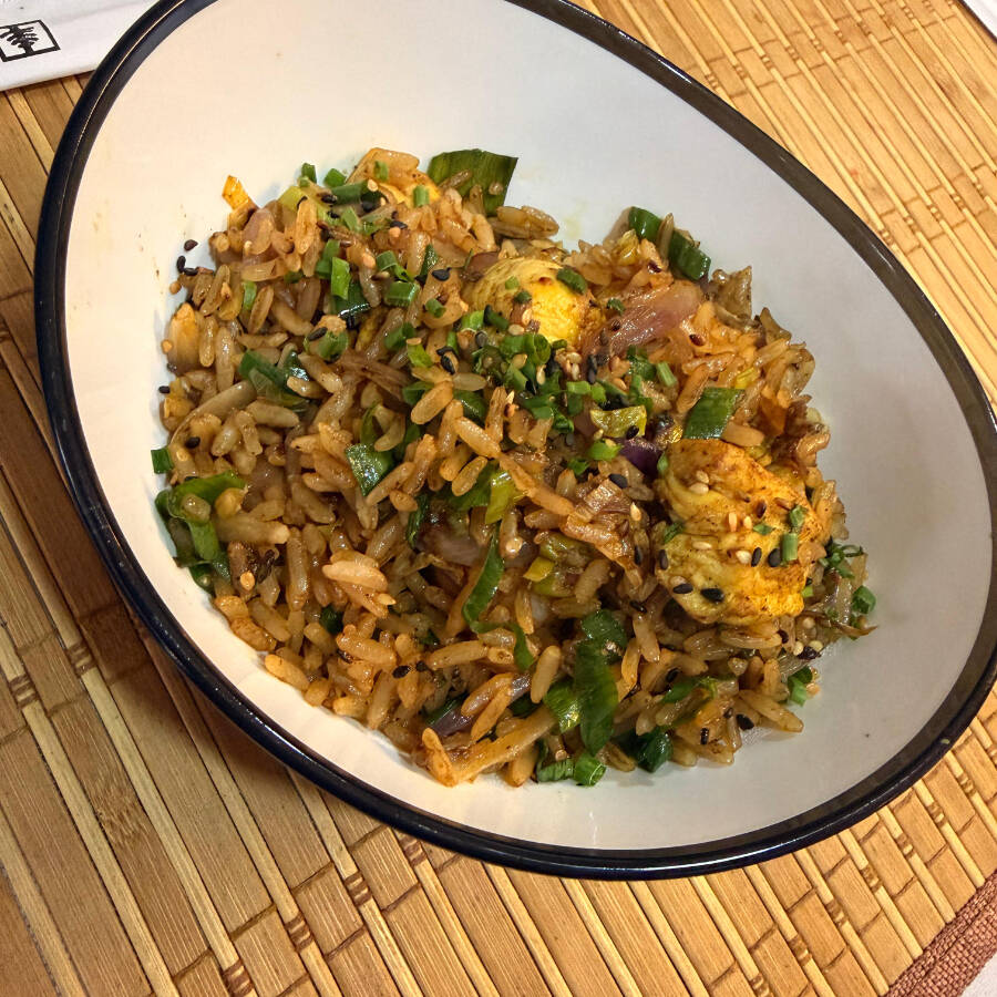 Arroz salteado tipo oriental con pollo y vegetales. ( picante leve)