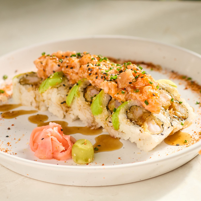 Salmon fresco, ensalada dinamita, aguacate, queso crema. Finalizado con un tartar de camarones de topping.