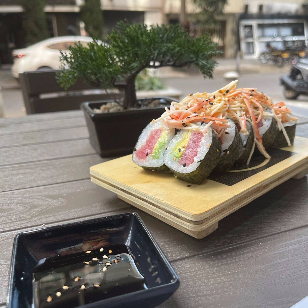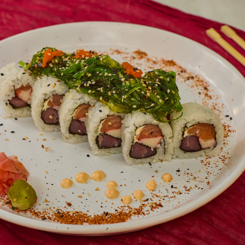 Roll fresco a base de salmon, kanikama, atún fresco, aguacate. Finalizado con seawed salad y masago.