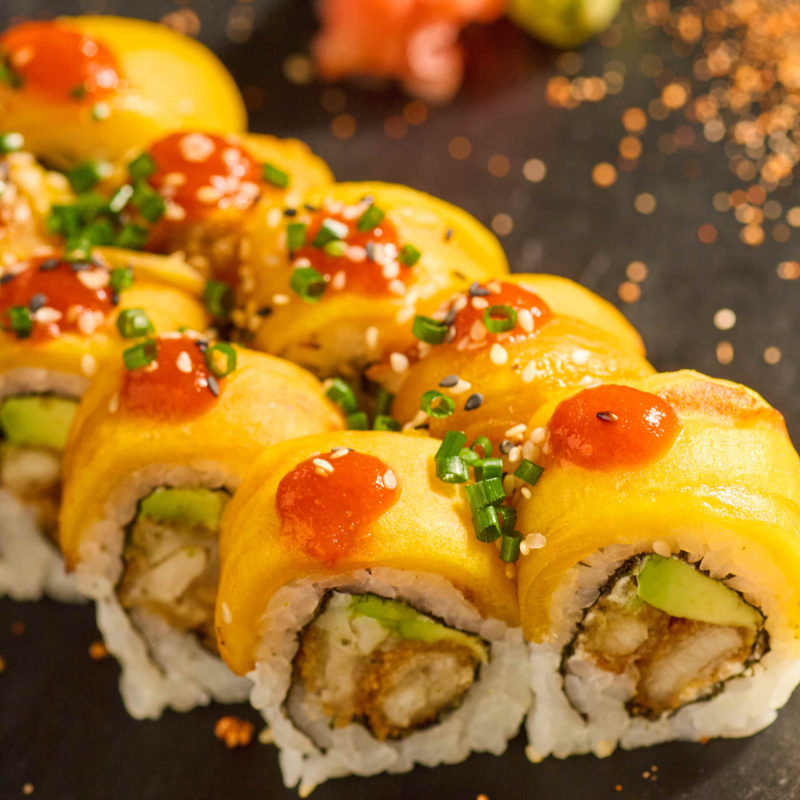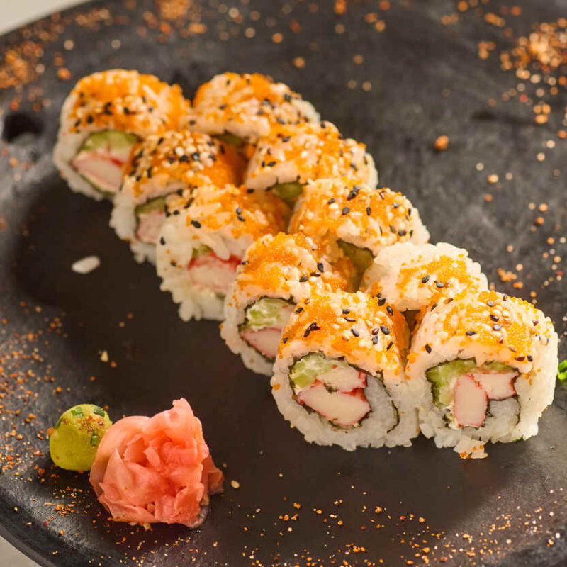 Sushi tradicional al estilo hamachi sushi, kanikama, queso crema y pepino, topping de masago.