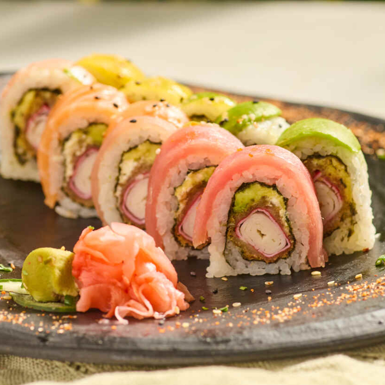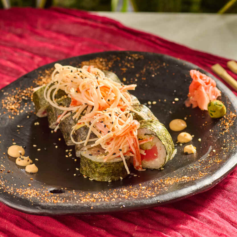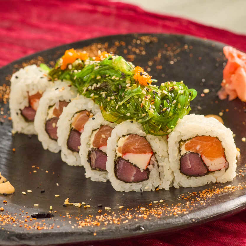 Delicioso Roll de atun, salmon, kanikama y queso crema. Finalizado con topping de wakame y caviar