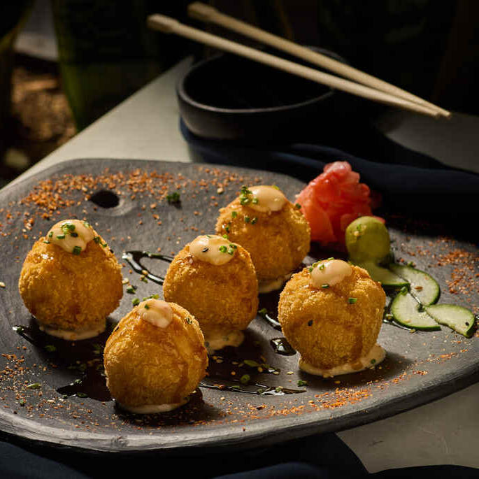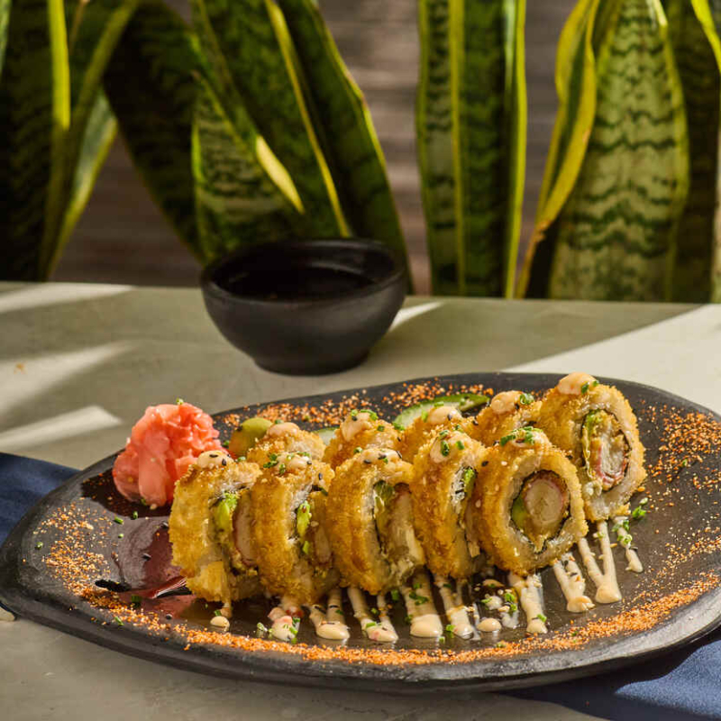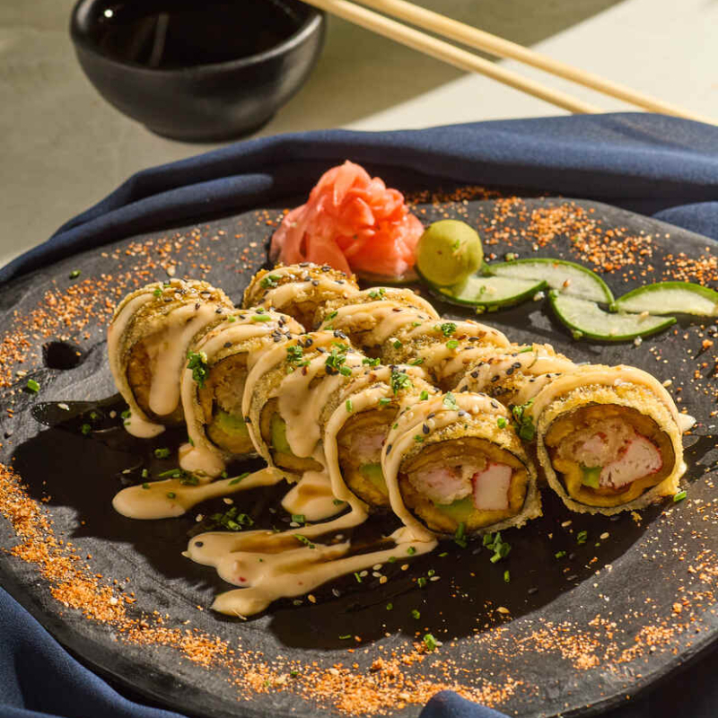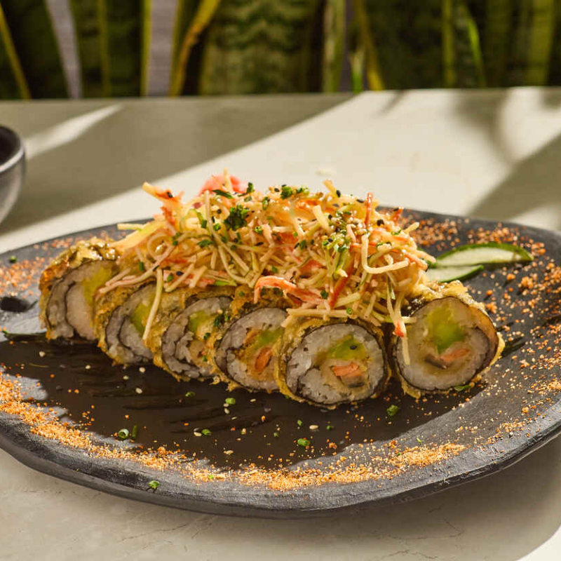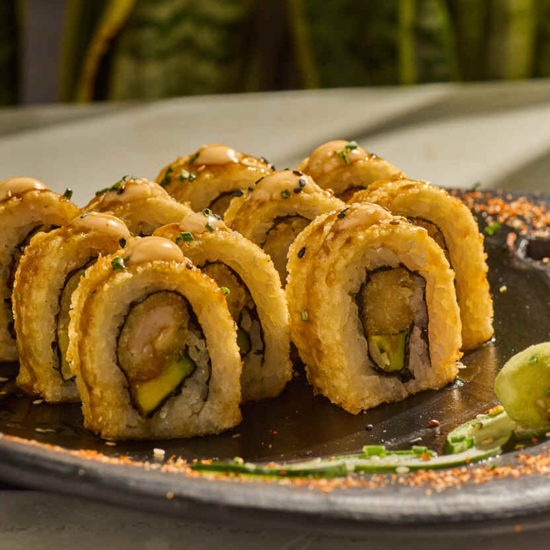 Delicioso roll apanado a base de plátano maduro, queso crema, palmitos y camarones apanados, finalizado con una salsa dragón de la casa.