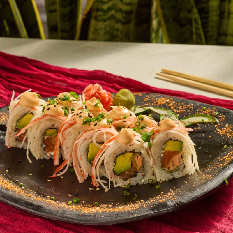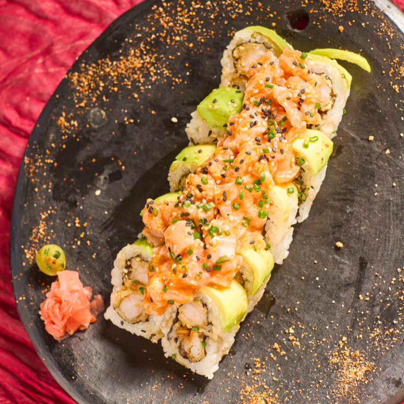 Delicioso Roll de ensalada dinamita, salmon fresco y aguacate. Finalizado con un tartar de camarones, caviar y salsa de la casa